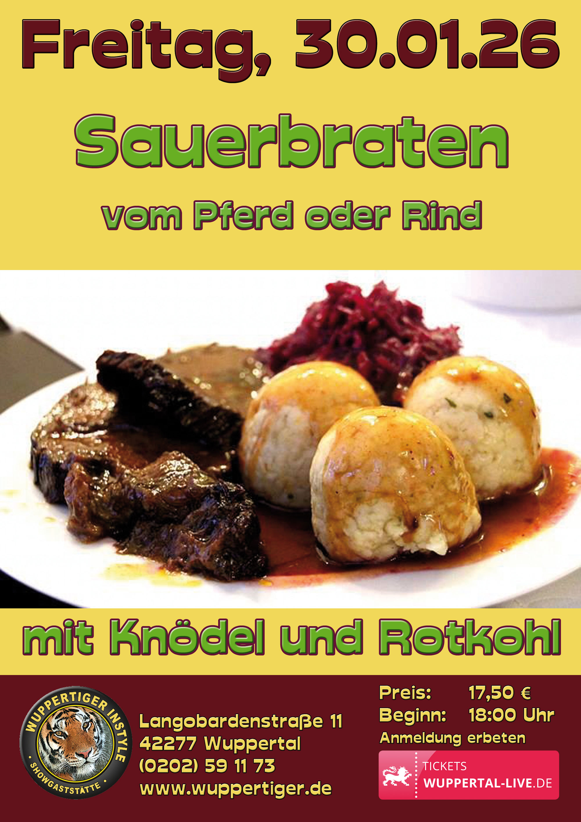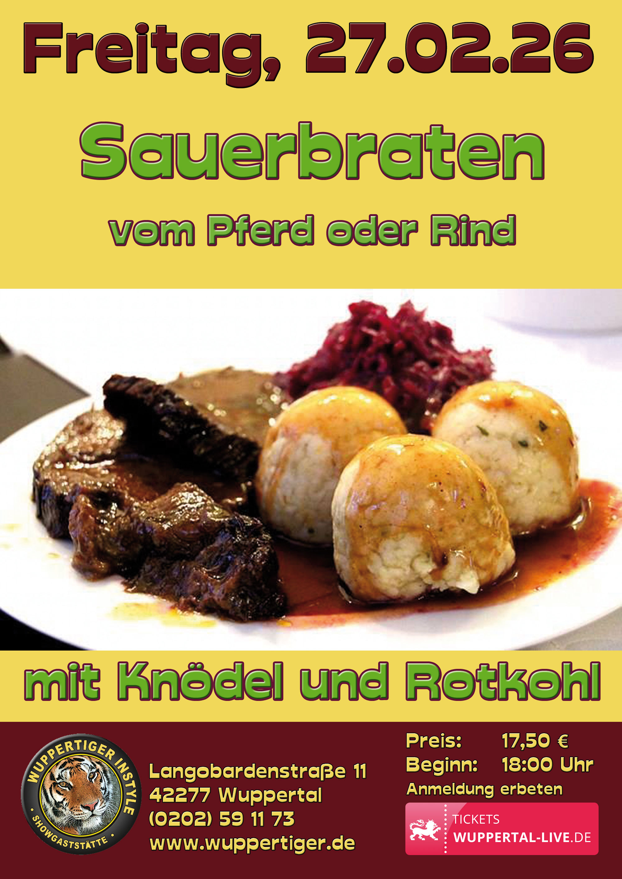 Sauerbraten - wahlweise vom Pferd oder Rind. Dazu gibt es Knödel und Rotkohl. |