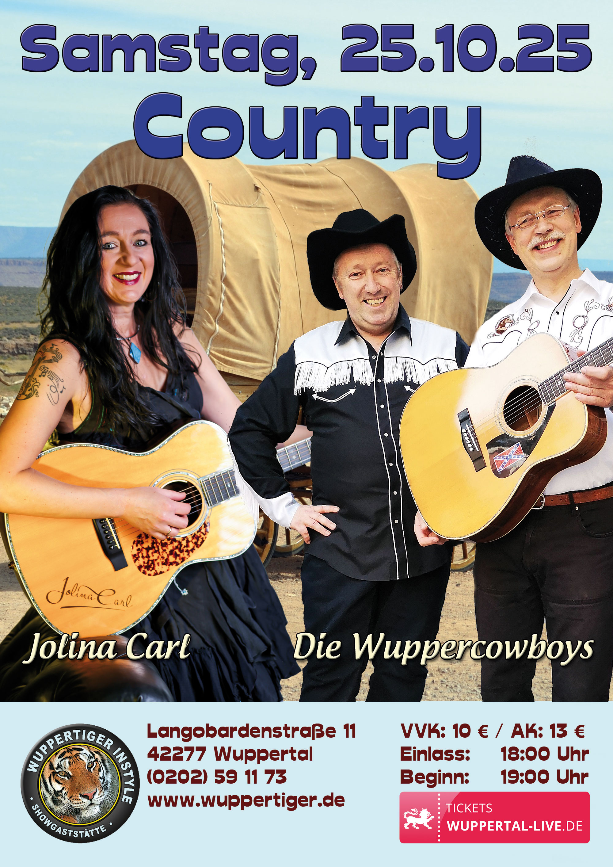 Jolina Carl (die German Queen of Country) und die Wuppercowboys werden uns wieder den wilden Westen in seiner schönsten Form präsentieren: mit deutschen und internationalen Country-Melodien. Also: Boots an ... Pferd satteln ... auf nach Oberbarmen! |