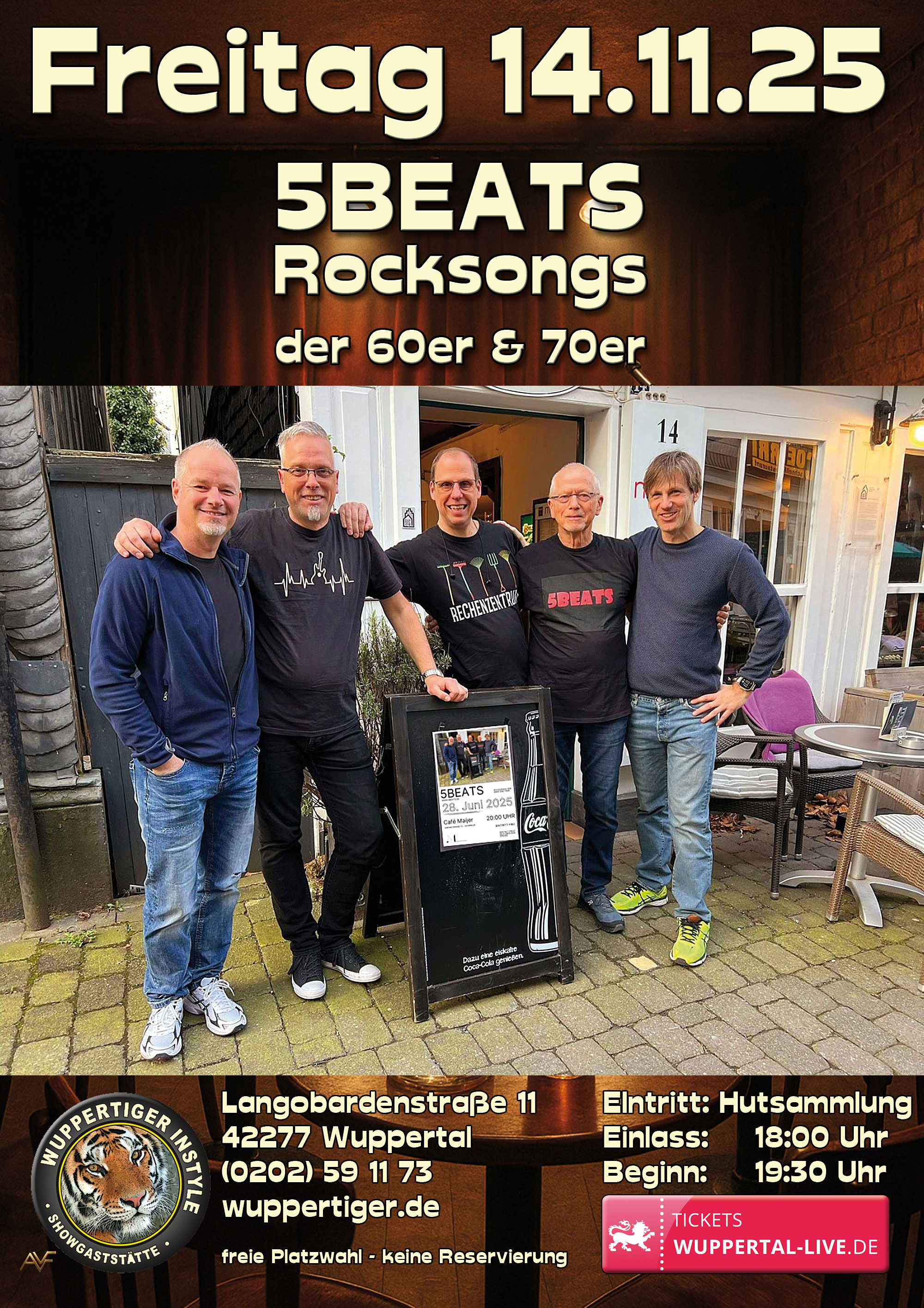 5BEATS spielen ein abwechslungsreiches Repertoire der 60er und 70er Jahre. Nach 7 Jahren sind die 5Beats endlich wieder in Wuppertal zu Gast. Freuen Sie sich auf einen stimmungsvollen Rockabend in gemütlicher Atmosphäre bei handgemachter Livemusik! |
