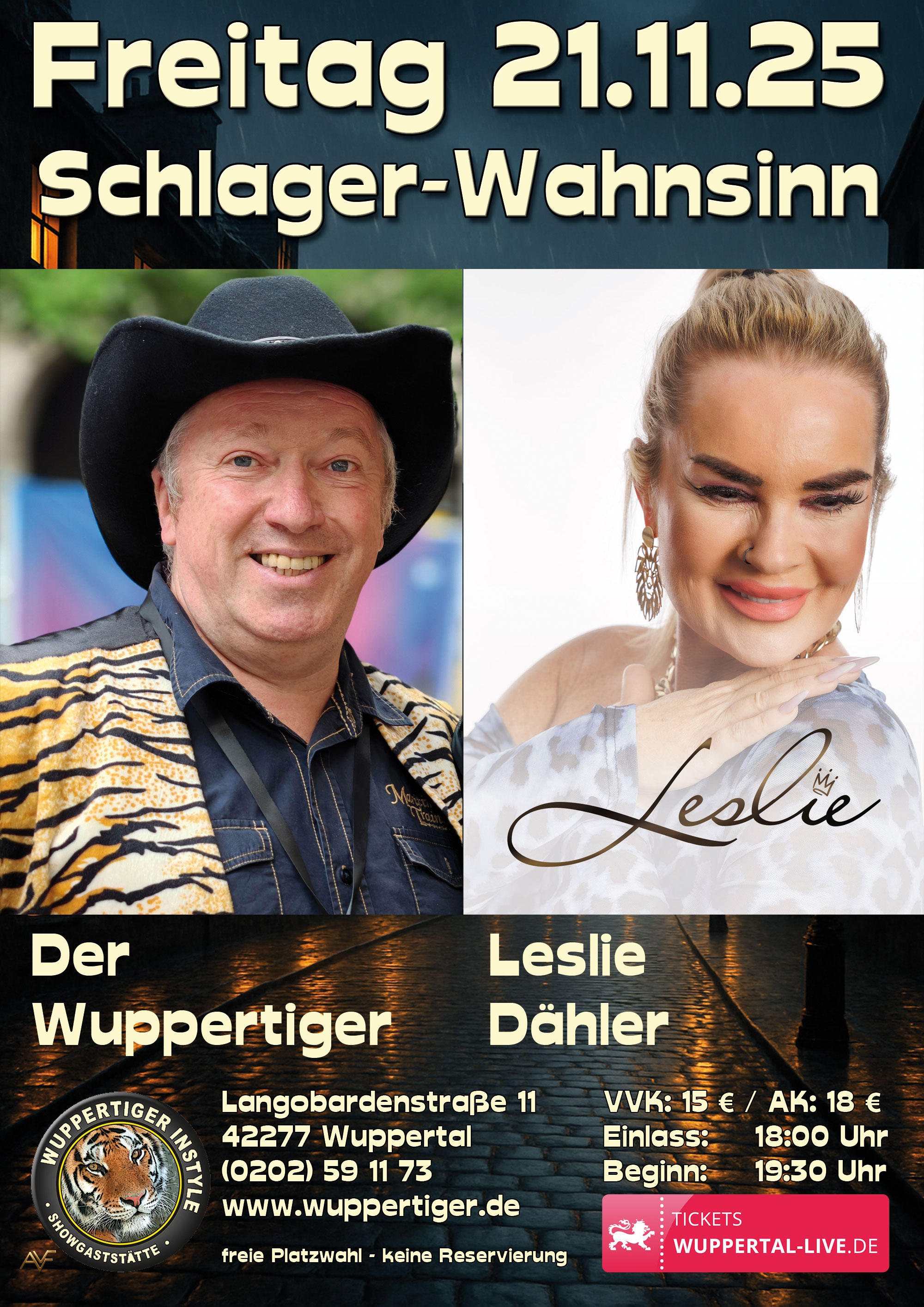 Leslie Dähler hat mit ihrem Titel "Ich hab den Wahnsinn überlebt" ihre Karriere nach Corona als "Leslie" fortgeführt. Und sie steht für den in Oberbarmen so beliebten deutschen Schlager in rhythmischem Sound. Und Der Wuppertiger hat in diesem Genre auch viele Hits zu bieten. |