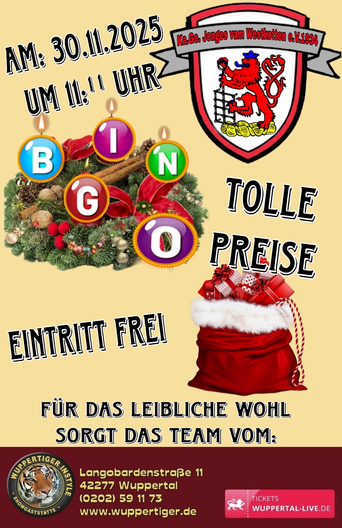 Die Ka.Ge.Jonges vam Westkotten e.V. 1934 veranstalten einen Bingo-Brunch. Sie werben mit tollen Preisen. Und für das leibliche Wohl sorgt das Team des Wuppertiger Instyle. |