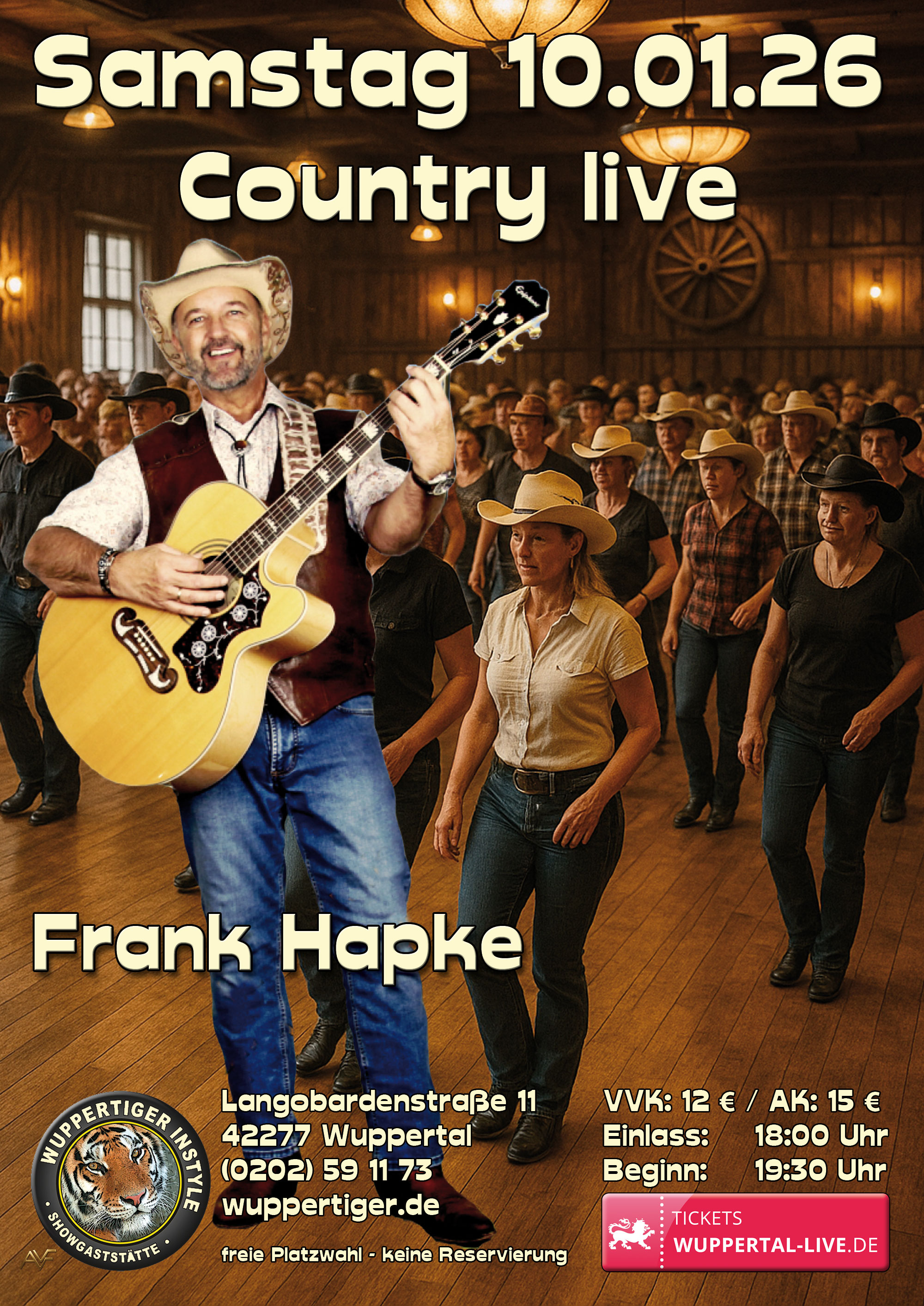 Frank Hapke singt und begleitet sich auf der Gitarre zu Countrysongs die wir alle lieben. Es wird ein toller Abend für Countryfans und für Linedancer! Also zum ersten mal im neuen Jahr: Boots an, Hut auf und mitfeiern! |