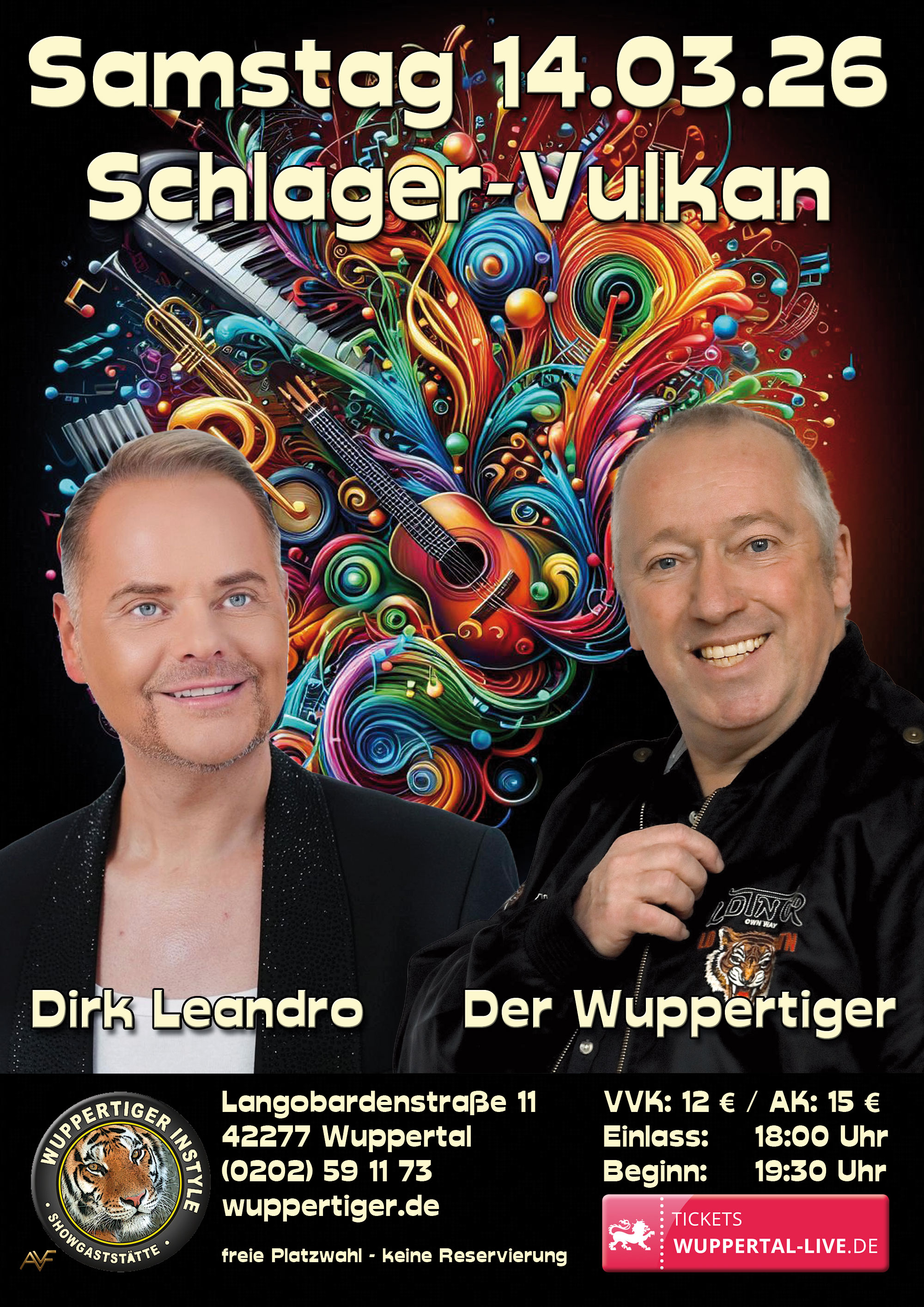 Dirk Leandro und Der Wuppertiger feiern DIE Schlagerparty in Oberbarmen! Es wird überwiegend deutsch gesungen - und mitgesungen. Dirk hat sich mit seinen Auftritten bei uns bereits eine eigene Fanbase aufgebaut - kommen Sie hinzu und feiern mit! |