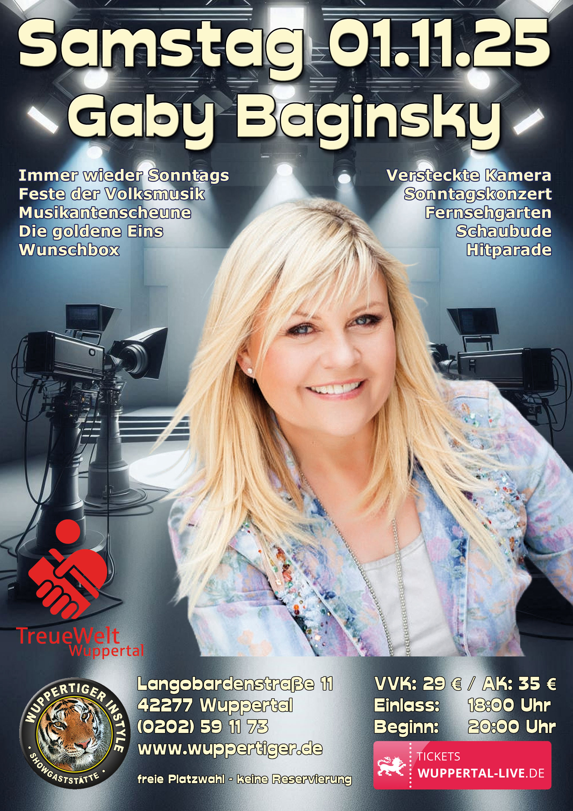 Wir freuen uns - heute ist ein sehr bekannter Fernsehstar bei uns zu Gast: Gaby Baginsky wird ihre Lieder live für uns singen! Sie war schon in vielen Fernsehshows und ihre Hits sind Evergreens ("Der Rum von Barbados", "Häng die Gitarre", "Du kriegst das hin"). |