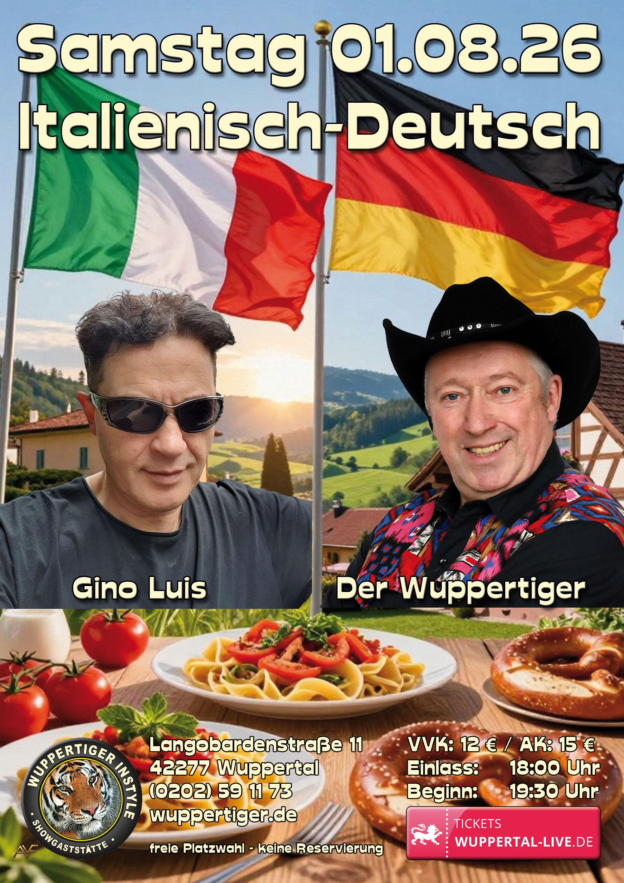 Gino Luis ("die Stimme von Adriano Celentano") und Der Wuppertiger bringen Sie musikalisch in den Süden. Wenn Sie dazu tanzen und Cocktails trinken fühlen Sie sich garantiert wie im Urlaub! |