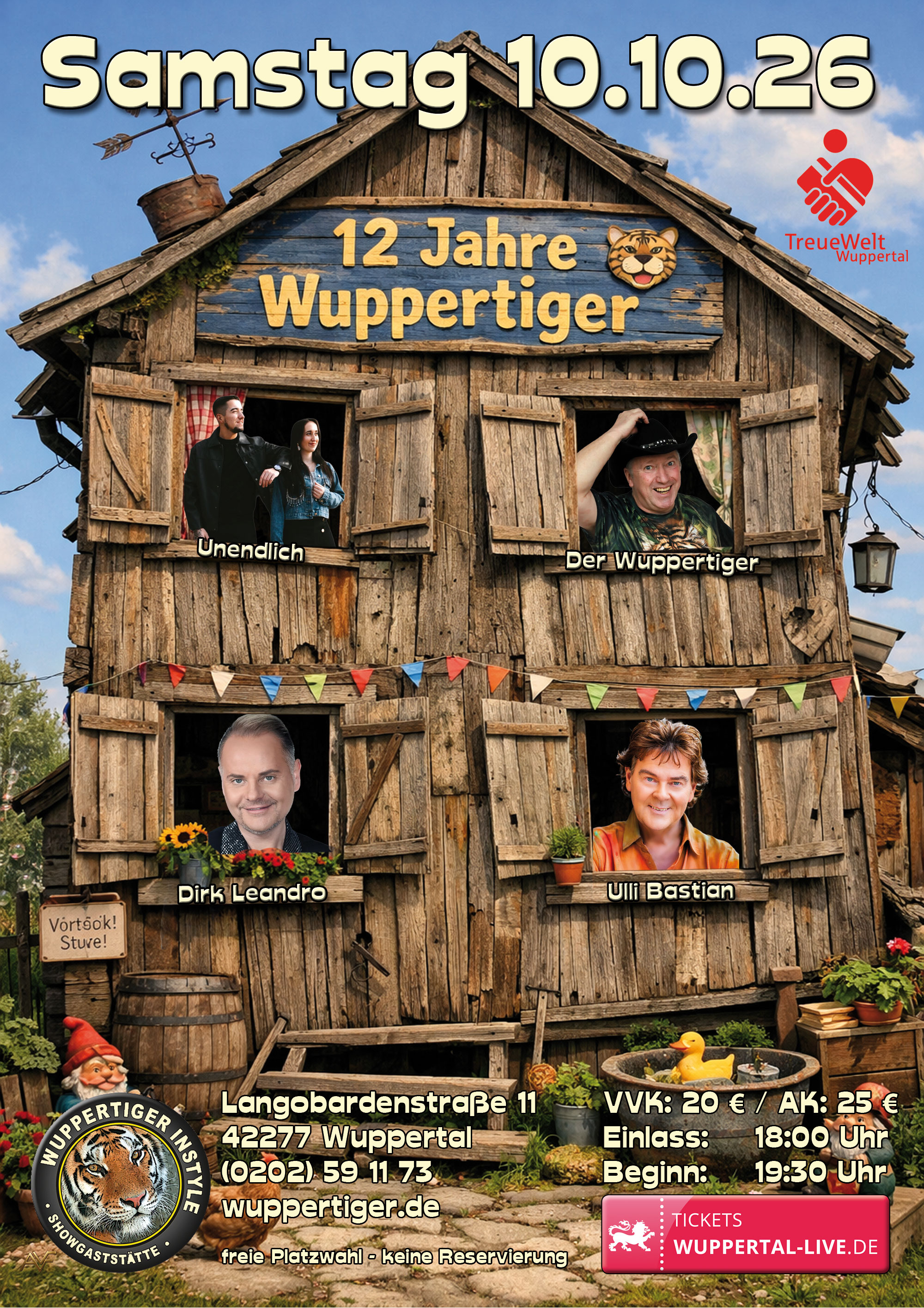 Der Wuppertiger lädt zum 12-jährigen Jubiläum des Wuppertiger Instyles hochkarätige Gäste ein: Ulli Bastian, Dirk Leandro und Unendlich werden mit ihm gemeinsam diesen Geburtstag feiern. Kommen Sie und feiern Sie mit! |